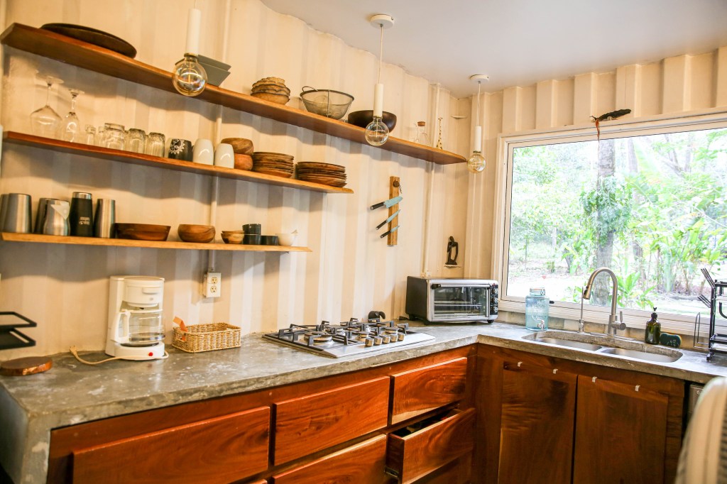 since it is our house and future office, we wanted to showcase our sustainable systems integration skills, and also test certain permaculture theories for validity and ease of operation. we installed a greywater tank that helps offset irrigation in the dry season with our bath and sink water. we also added a green roof and charred cedar siding to keep the sun from hitting the container so it stays cool. lastly, we have composting toilets and a compost bin for food waste, and a grey-water storage system that keep our gardens lush year round.